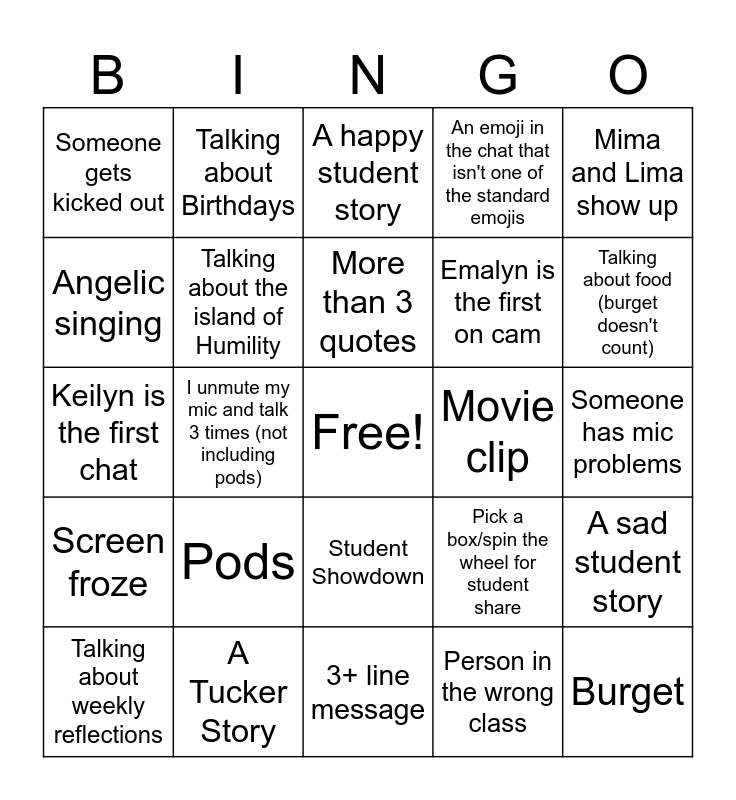 This bingo card has a free space and 24 words: Pods, A Tucker Story, More than 3 quotes, Talking about weekly reflections, Mima and Lima show up, Someone gets kicked out, Angelic singing, Talking about Birthdays, Movie clip, Student Showdown, Emalyn is the first on cam, Keilyn is the first chat, Pick a box/spin the wheel for student share, A sad student story, Talking about the island of Humility, Person in the wrong class, Someone has mic problems, A happy student story, Talking about food (burget doesn't count), I unmute my mic and talk 3 times (not including pods), Burget, Screen froze, An emoji in the chat that isn't one of the standard emojis and 3+ line message.