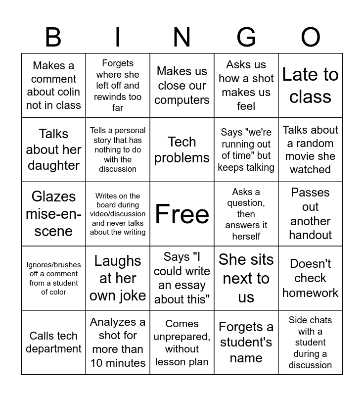 This bingo card has a free space and 24 words: Laughs at her own joke, Analyzes a shot for more than 10 minutes, Tech problems, Calls tech department, Late to class, Makes a comment about colin not in class, Talks about her daughter, Forgets where she left off and rewinds too far, Asks a question, then answers it herself, Says "I could write an essay about this", Says "we're running out of time" but keeps talking, Glazes mise-en-scene, She sits next to us, Doesn't check homework, Tells a personal story that has nothing to do with the discussion, Forgets a student's name, Passes out another handout, Makes us close our computers, Talks about a random movie she watched, Writes on the board during video/discussion and never talks about the writing, Side chats with a student during a discussion, Ignores/brushes off a comment from a student of color, Asks us how a shot makes us feel and Comes unprepared, without lesson plan.