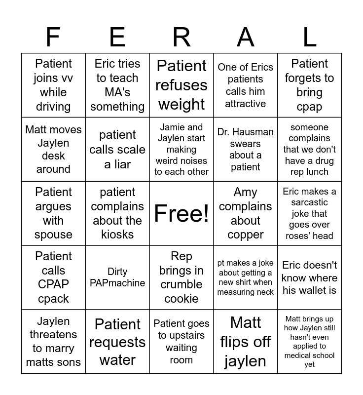 This bingo card has 25 words: Patient calls CPAP cpack, Patient requests water, Free!, Matt flips off jaylen, Patient forgets to bring cpap, Patient joins vv while driving, Eric tries to teach MA's something, Patient refuses weight, Amy complains about copper, Eric doesn't know where his wallet is, Matt moves Jaylen desk around, patient calls scale a liar, Patient goes to upstairs waiting room, pt makes a joke about getting a new shirt when measuring neck, someone complains that we don't have a drug rep lunch, Jaylen threatens to marry matts sons, patient complains about the kiosks, Jamie and Jaylen start making weird noises to each other, Dr. Hausman swears about a patient, Eric makes a sarcastic joke that goes over roses' head, Patient argues with spouse, Dirty PAPmachine, Rep brings in crumble cookie, One of Erics patients calls him attractive and Matt brings up how Jaylen still hasn't even applied to medical school yet.