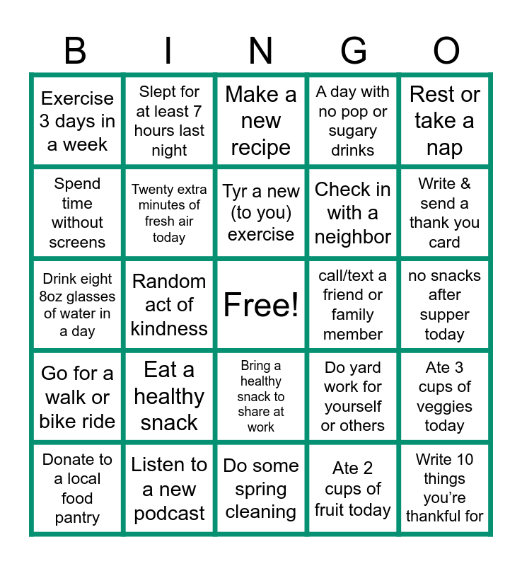 This bingo card has a free space and 24 words: Eat a healthy snack, Listen to a new podcast, Tyr a new (to you) exercise, Donate to a local food pantry, Rest or take a nap, Exercise 3 days in a week, Spend time without screens, Slept for at least 7 hours last night, call/text a friend or family member, Bring a healthy snack to share at work, Check in with a neighbor, Drink eight 8oz glasses of water in a day, Do yard work for yourself or others, Ate 3 cups of veggies today, Twenty extra minutes of fresh air today, Ate 2 cups of fruit today, no snacks after supper today, Make a new recipe, Write & send a thank you card, Random act of kindness, Write 10 things you’re thankful for, Go for a walk or bike ride, A day with no pop or sugary drinks and Do some spring cleaning.