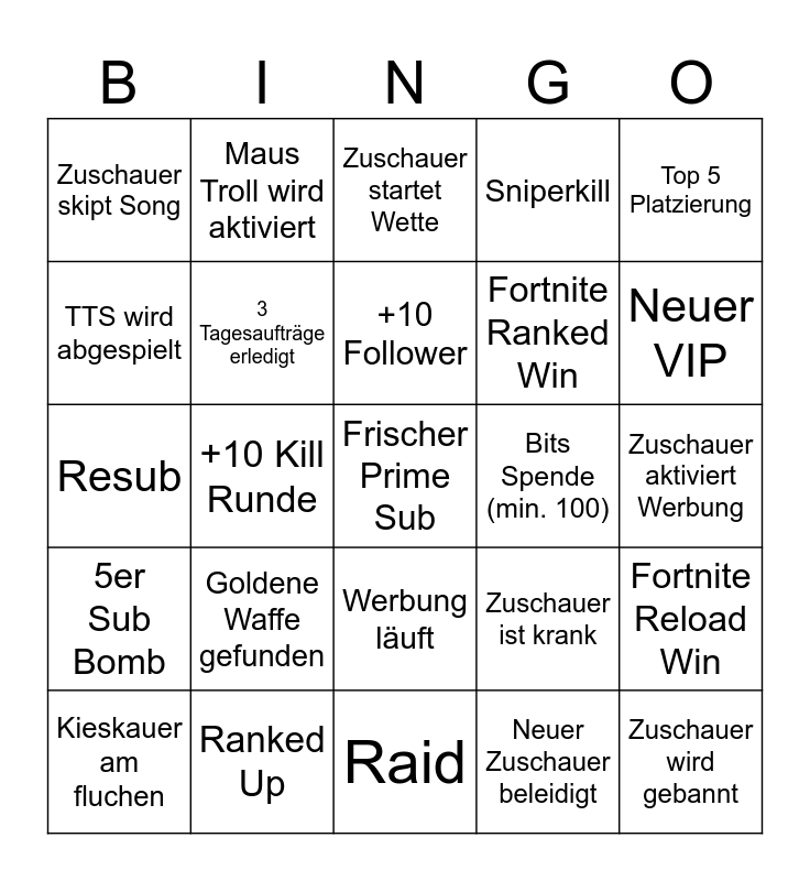 This bingo card has a free space and 24 words: Goldene Waffe gefunden, Ranked Up, +10 Follower, Kieskauer am fluchen, Top 5 Platzierung, Zuschauer skipt Song, TTS wird abgespielt, Maus Troll wird aktiviert, Bits Spende (min. 100), Werbung läuft, Fortnite Ranked Win, Resub, Zuschauer ist krank, Fortnite Reload Win, 3 Tagesaufträge erledigt, Neuer Zuschauer beleidigt, Zuschauer aktiviert Werbung, Zuschauer startet Wette, Neuer VIP, +10 Kill Runde, Zuschauer wird gebannt, 5er Sub Bomb, Sniperkill and Raid.