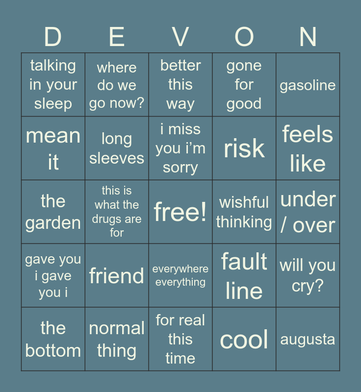 This bingo card has a free space and 79 words: the way that i see you, love me, just for the season, better this way, losing game, marriage story, a little hope never hurt, how could you?, get clean, remind me, older, afraid of heights, less like me, gone for good, talking in your sleep, easy, mean it, stay, friend, 21, under / over, tehe, gasoline, the garden, i miss you iβm sorry, long sleeves, minor, brush fire, unlearn, mess it up, alright, feels like, rockland, for real this time, camden, the bottom, wishful thinking, older, better, hard to sleep, augusta, painkillers, alright, block me out, difficult, i know it wonβt work, where do we go now?, amelie, best, full machine, i should hate you, will you cry?, this is what the drugs are for, fault line, the blue, right now, unsteady, 405, two people, cedar, everywhere everything, risk, close to you, felt good about you, blowing smoke, i love you im sorry, us, let it happen, tough love, i knew it i know you, gave you i gave you i, normal thing, good luck charlie, free now, close to you, i know it wont work - live, cool, thatβs so true, i told you things and packing it up.