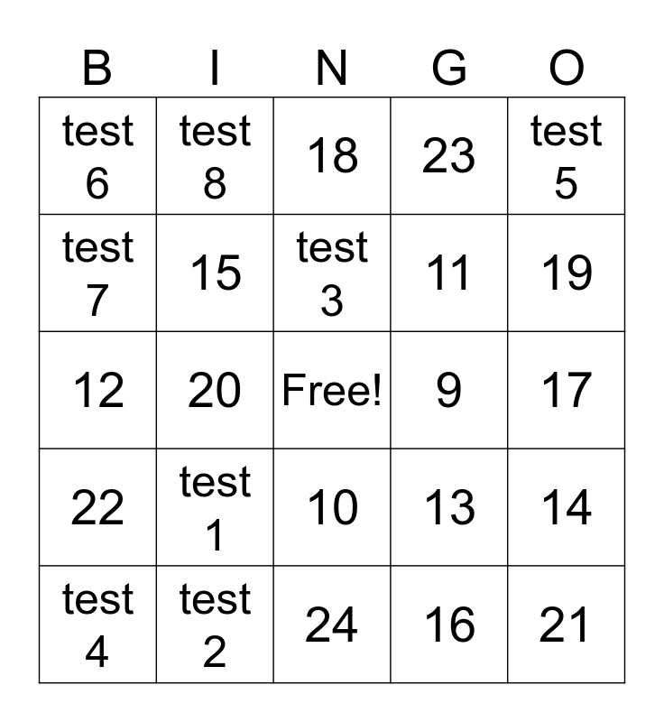 This bingo card has a free space and 24 words: test 1, test 2, test 3, test 4, test 5, test 6, test 7, test 8, 9, 10, 11, 12, 13, 14, 15, 16, 17, 18, 19, 20, 21, 22, 23 and 24.