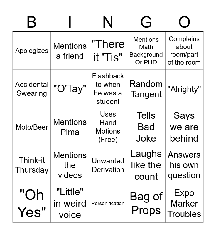 This bingo card has a free space and 24 words: "Oh Yes", Mentions the videos, Flashback to when he was a student, Bag of Props, Complains about room/part of the room, Apologizes, Mentions a friend, "There it 'Tis", Tells Bad Joke, Says we are behind, Moto/Beer, "O'Tay", Laughs like the count, Answers his own question, Accidental Swearing, "Little" in weird voice, Personification, Mentions Math Background Or PHD, "Alrighty", Think-it Thursday, Mentions Pima, Unwanted Derivation, Random Tangent and Expo Marker Troubles.