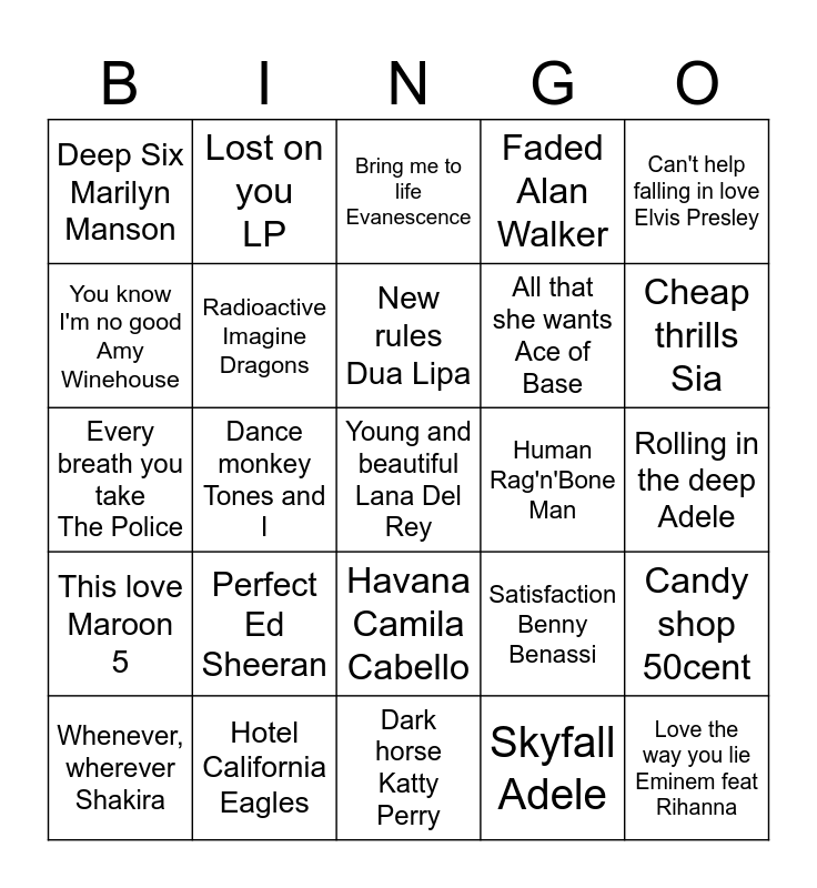 This bingo card has a free space and 28 words: Candy shop 50cent, Dancing Queen ABBA, All that she wants Ace of Base, Skyfall Adele, You know I'm no good Amy Winehouse, Bring me to life Evanescence, Lost on you LP, This love Maroon 5, Human Rag'n'Bone Man, Whenever, wherever Shakira, Every breath you take The Police, Faded Alan Walker, Hotel California Eagles, Dark horse Katty Perry, Cheap thrills Sia, Shape of my heart Sting, Perfect Ed Sheeran, Radioactive Imagine Dragons, New rules Dua Lipa, Havana Camila Cabello, Deep Six Marilyn Manson, In the end Linkin Park, Love the way you lie Eminem feat Rihanna, Dance monkey Tones and I, Rolling in the deep Adele, Satisfaction Benny Benassi, Can't help falling in love Elvis Presley and Happy Pharrell Williams.