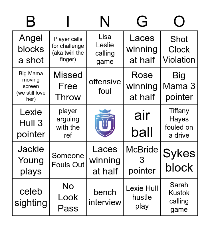 This bingo card has a free space and 33 words: player yells "and one!!" and actually gets the call, coach technical foul, player arguing with the ref, Point Gawd 3 pointer, Jackie Young plays, Missed Free Throw, Shot Clock Violation, celeb sighting, Player calls for challenge (aka twirl the finger), Made free throw, offensive foul, Lisa Leslie calling game, Official Review, Hiedeman steal, air ball, Big Mama 3 pointer, No Look Pass, Lexie Hull 3 pointer, Someone Fouls Out, McBride 3 pointer, Laces winning at half, Buzzer Beater, Angel blocks a shot, Tiffany Hayes fouled on a drive, bench interview, Sarah Kustok calling game, Laces winning at half, Rose winning at half, Big Mama moving screen (we still love her), Sykes block, tunnel fit montage, Lexie Hull hustle play and Angel Reese o-board and put back.