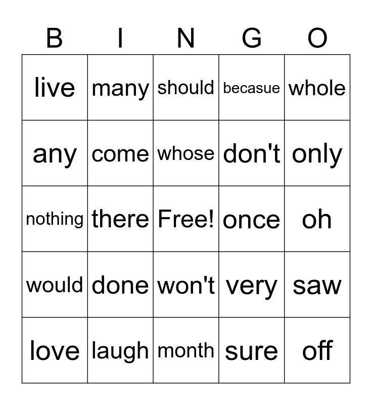 This bingo card has a free space and 26 words: won't, sure, whose, laugh, whole, live, any, many, oh, very, don't, nothing, saw, love, there, where, becasue, would, should, off, only, month, once, done, come and almost.