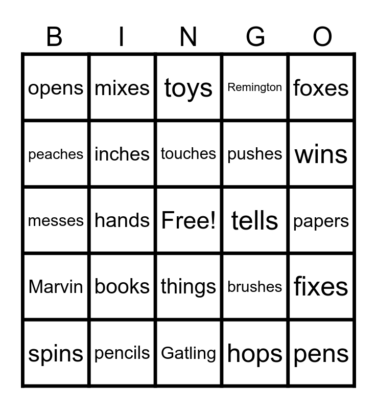 This bingo card has a free space and 24 words: books, pencils, touches, spins, foxes, opens, peaches, mixes, tells, things, pushes, messes, brushes, fixes, inches, hops, papers, toys, wins, hands, pens, Marvin, Remington and Gatling.