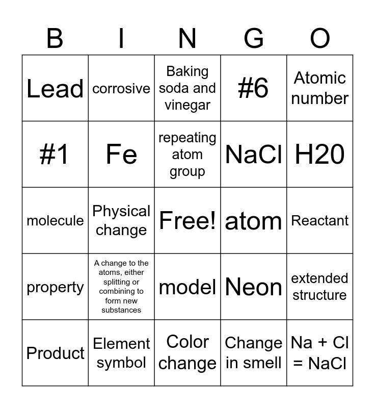 This bingo card has a free space and 29 words: Product, Fizzing and bubbling, Physical change, rearrange, Lead, Baking soda and vinegar, Fe, A change to the atoms, either splitting or combining to form new substances, atom, Element symbol, Reactant, Na + Cl = NaCl, Color change, Change in smell, H20, rust, model, property, Atomic number, molecule, Neon, atom, NaCl, #1, #6, corrosive, extended structure, repeating atom group and scale.
