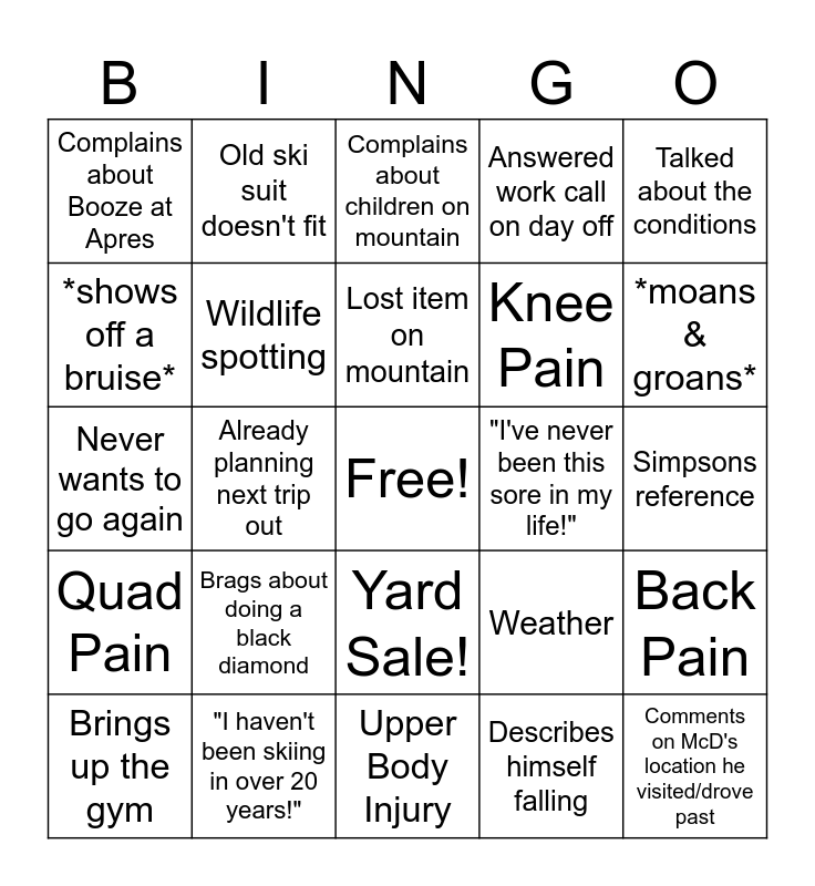 This bingo card has a free space and 24 words: Brags about doing a black diamond, "I haven't been skiing in over 20 years!", Lost item on mountain, Brings up the gym, Talked about the conditions, Complains about Booze at Apres, *shows off a bruise*, Old ski suit doesn't fit, "I've never been this sore in my life!", Yard Sale!, Knee Pain, Never wants to go again, Weather, Back Pain, Wildlife spotting, Describes himself falling, Simpsons reference, Complains about children on mountain, *moans & groans*, Already planning next trip out, Comments on McD's location he visited/drove past, Quad Pain, Answered work call on day off and Upper Body Injury.