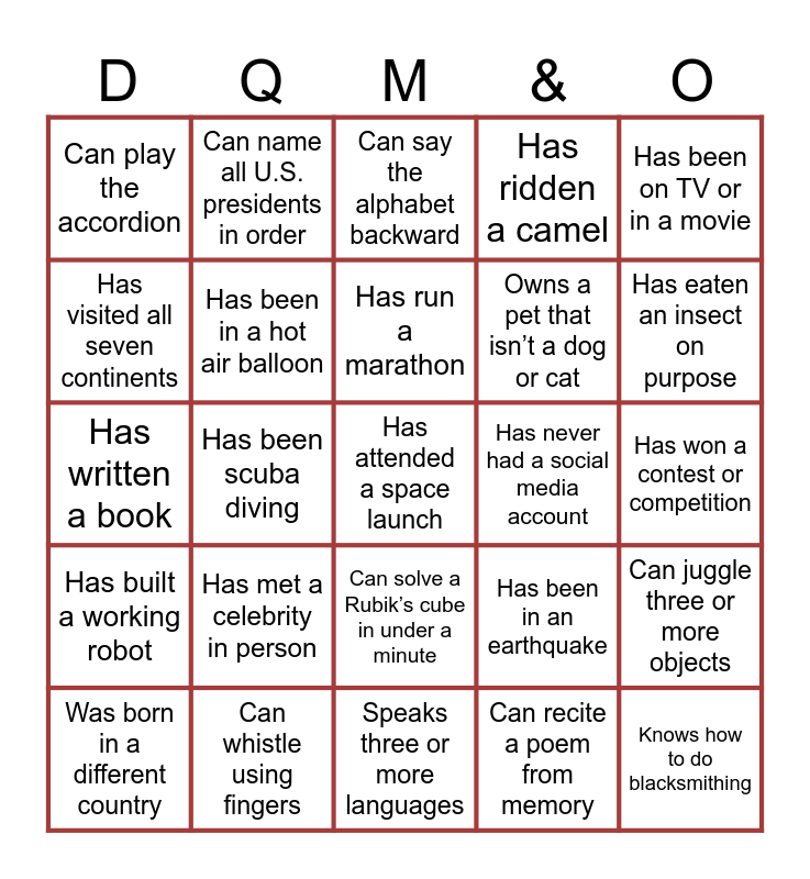 This bingo card has 25 words: Has met a celebrity in person, Speaks three or more languages, Has run a marathon, Was born in a different country, Has been on TV or in a movie, Can play the accordion, Has visited all seven continents, Can name all U.S. presidents in order, Has never had a social media account, Can solve a Rubik’s cube in under a minute, Owns a pet that isn’t a dog or cat, Has written a book, Has been in an earthquake, Can juggle three or more objects, Has been in a hot air balloon, Knows how to do blacksmithing, Has won a contest or competition, Can say the alphabet backward, Has eaten an insect on purpose, Has been scuba diving, Has attended a space launch, Can whistle using fingers, Has built a working robot, Has ridden a camel and Can recite a poem from memory.