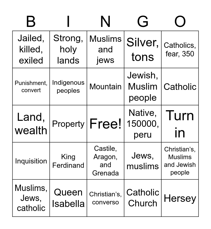 This bingo card has a free space and 24 words: King Ferdinand, Queen Isabella, Mountain, Muslims, Jews, catholic, Catholics, fear, 350, Jailed, killed, exiled, Punishment, convert, Strong, holy lands, Native, 150000, peru, Castile, Aragon, and Grenada, Jewish, Muslim people, Land, wealth, Jews, muslims, Christian’s, Muslims and Jewish people, Indigenous peoples, Catholic Church, Turn in, Muslims and jews, Catholic, Property, Hersey, Inquisition, Silver, tons and Christian’s, converso.