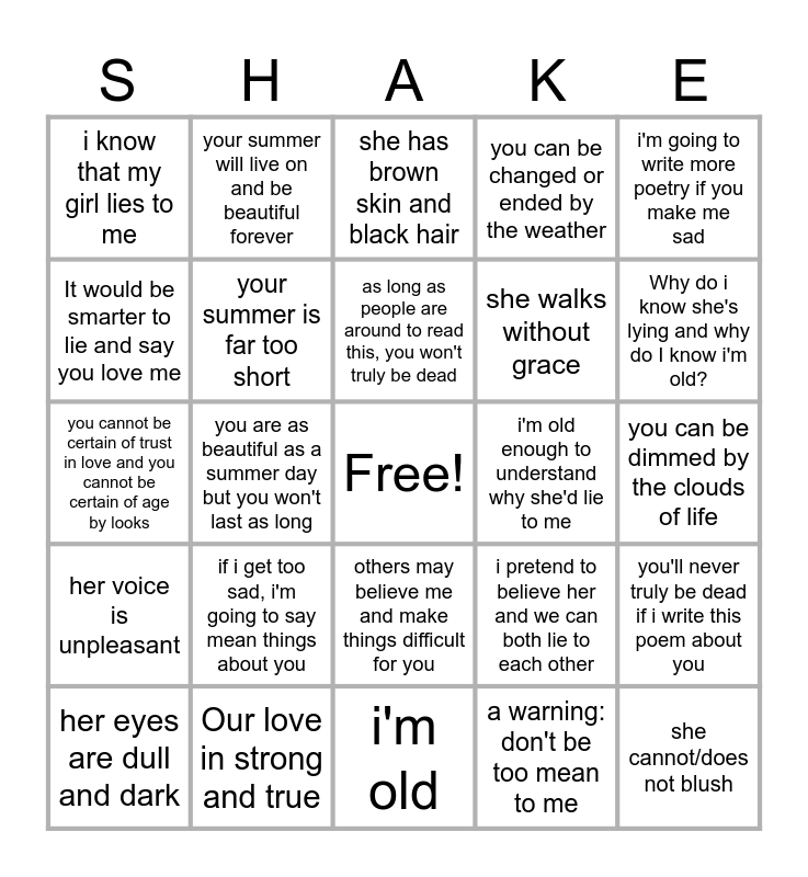 This bingo card has a free space and 29 words: her eyes are dull and dark, we lie to each other and we are in love, you are as beautiful as a summer day but you won't last as long, im going to die without notice, i know that my girl lies to me, she has brown skin and black hair, your summer is far too short, if i get too sad, i'm going to say mean things about you, i'm old enough to understand why she'd lie to me, Our love in strong and true, you can be dimmed by the clouds of life, she cannot/does not blush, i'm old, a warning: don't be too mean to me, Why do i know she's lying and why do I know i'm old?, her breath smells bad, others may believe me and make things difficult for you, her voice is unpleasant, i'm going to write more poetry if you make me sad, you cannot be certain of trust in love and you cannot be certain of age by looks, i pretend to believe her and we can both lie to each other, Lie to me, in order to stay safe, she walks without grace, It would be smarter to lie and say you love me, you can be changed or ended by the weather, your summer will live on and be beautiful forever, you'll never truly be dead if i write this poem about you, as long as people are around to read this, you won't truly be dead and love really makes you blind because my girl is ugly ngl.