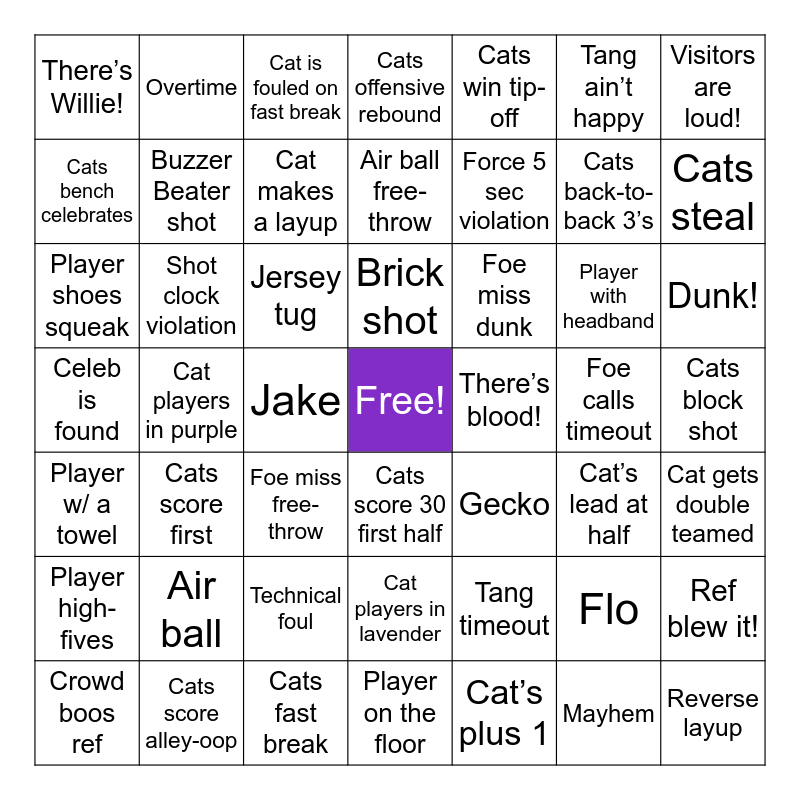 This bingo card has a free space and 57 words: Cats 3-pointer, Dunk!, Cats force turnover, There’s Willie!, Cat players in purple, Cat players in lavender, Visitors are loud!, Fan with sign, Buzzer Beater shot, Tang timeout, Cats offensive rebound, Player high-fives, Player w/ a towel, Cats block shot, Cats fast break, Cats score first, Cats win tip-off, Force 5 sec violation, Cats take charge, Cats back-to-back 3’s, Cats steal, Foe miss free-throw, Foe miss dunk, Cat is fouled on fast break, Cat hits mid-range, Cats bench celebrates, Foe calls timeout, Foe player fouls out, Cat makes a layup, Cats score 30 first half, Cat’s huddles on court, Cat gets double teamed, Cats score alley-oop, Player on the floor, Player shoes squeak, Tang ain’t happy, Air ball, Air ball free-throw, Technical foul, Shot clock violation, Overtime, Brick shot, Reverse layup, Behind the back pass, Ref blew it!, Crowd boos ref, Jersey tug, Celeb is found, Cat’s plus 1, Cat’s lead at half, There’s blood!, Jake, Gecko, Flo, Mayhem, Player with headband and Cats dive for ball.