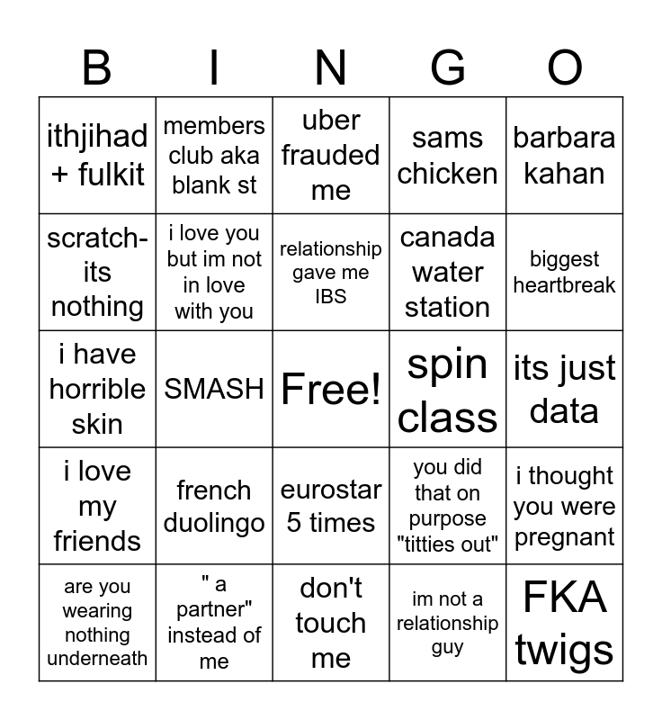 This bingo card has a free space and 24 words: french duolingo, " a partner" instead of me, relationship gave me IBS, are you wearing nothing underneath, barbara kahan, ithjihad + fulkit, scratch-its nothing, members club aka blank st, spin class, eurostar 5 times, canada water station, i have horrible skin, you did that on purpose "titties out", i thought you were pregnant, i love you but im not in love with you, im not a relationship guy, its just data, uber frauded me, biggest heartbreak, SMASH, FKA twigs, i love my friends, sams chicken and don't touch me.