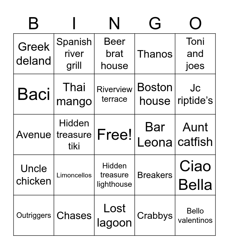 This bingo card has a free space and 24 words: Limoncellos, Chases, Riverview terrace, Outriggers, Toni and joes, Greek deland, Baci, Spanish river grill, Bar Leona, Hidden treasure lighthouse, Boston house, Avenue, Breakers, Ciao Bella, Thai mango, Crabbys, Aunt catfish, Beer brat house, Jc riptide’s, Hidden treasure tiki, Bello valentinos, Uncle chicken, Thanos and Lost lagoon.