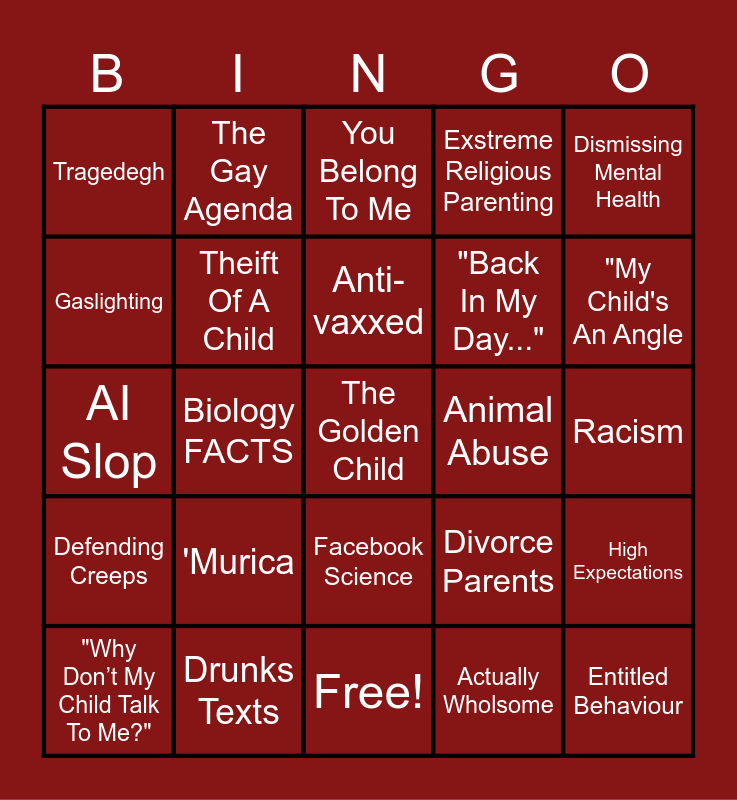 This bingo card has 25 words: Defending Creeps, Drunks Texts, The Golden Child, Actually Wholsome, Dismissing Mental Health, Tragedegh, The Gay Agenda, You Belong To Me, Animal Abuse, High Expectations, Gaslighting, Theift Of A Child, Free!, Divorce Parents, "My Child's An Angle, "Why Don’t My Child Talk To Me?", Biology FACTS, Anti-vaxxed, "Back In My Day...", Racism, AI Slop, 'Murica, Facebook Science, Exstreme Religious Parenting and Entitled Behaviour.