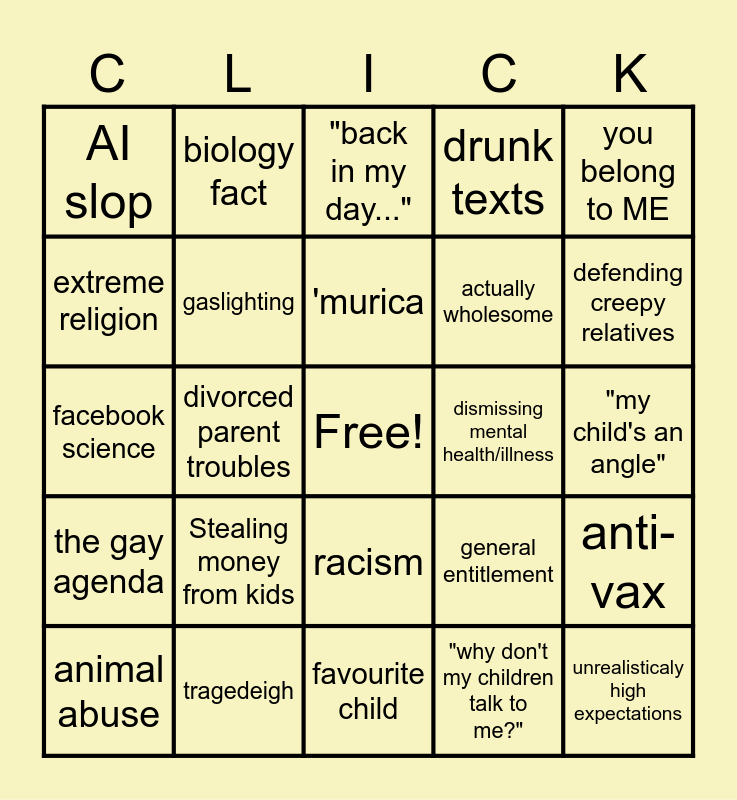 This bingo card has a free space and 24 words: Stealing money from kids, tragedeigh, 'murica, animal abuse, you belong to ME, AI slop, extreme religion, biology fact, dismissing mental health/illness, racism, actually wholesome, facebook science, general entitlement, anti-vax, gaslighting, "why don't my children talk to me?", "my child's an angle", "back in my day...", defending creepy relatives, divorced parent troubles, unrealisticaly high expectations, the gay agenda, drunk texts and favourite child.