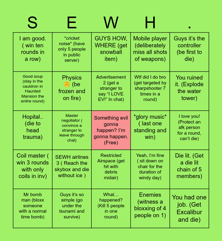 This bingo card has a free space and 24 words: Mr bomb man (bloxx someone with a normal time bomb), SEWH airlines 3 ( Reach the skybox and die without ice ), Advertisement 2 (get a stranger to say “I LOVE EV!” In chat), Enemies (witness a bloxxing of 4 people on 1), Guys it’s the controller (be first to die), I am good. ( win ten rounds in a row), *cricket noise* (have only 5 people in public server), GUYS HOW, WHERE (get snowball item), *glory music* ( last one standing and win), I love you! (Protect an afk person for a round, can’t die), Hopital.. (die to head trauma), Physics 🙃 (be frozen and on fire), Yeah, I’m fine ( sit down on chair for the duration of windy day), Die lit. (Get a die lit chain of 5 members), Good soup (stay in the cauldron in Haunted Mansion the entire round), Guys it’s so simple (go under the tsunami and survive), What… happened? (Kill 5 people in one round), Mobile player (deliberately miss all shots of weapons), You ruined it. (Explode the water tower), Coil master ( win 3 rounds with only coils in inv), Master negotiator ( convince a stranger to leave through chat), Restricted Airspace (get hit with debris midair), Wtf did I do bro (get targeted by sharpshooter 7 times in a round) and You had one job. (Get Excalibur and die).