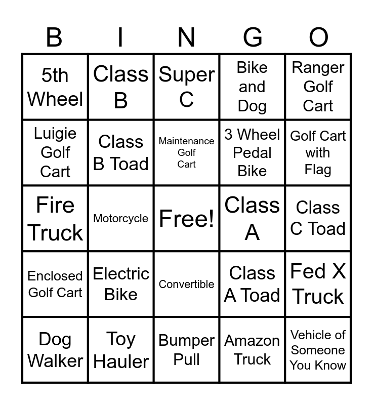 This bingo card has a free space and 24 words: Dog Walker, Electric Bike, Maintenance Golf Cart, Amazon Truck, Ranger Golf Cart, 5th Wheel, Class B, Super C, Class A, Class C Toad, Fire Truck, Class B Toad, Class A Toad, Fed X Truck, Luigie Golf Cart, Toy Hauler, Bumper Pull, Bike and Dog, Golf Cart with Flag, Enclosed Golf Cart, Motorcycle, Convertible, 3 Wheel Pedal Bike and Vehicle of Someone You Know.