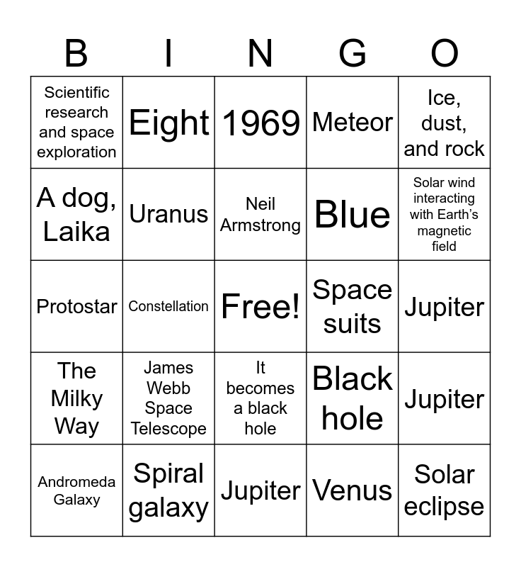 This bingo card has a free space and 40 words: The Sun, Protostar, Mercury, Uranus, Spiral galaxy, It becomes a black hole, Neil Armstrong, Saturn, Ice, dust, and rock, The Milky Way, Constellation, Meteor, Solar eclipse, Jupiter, Space suits, James Webb Space Telescope, Mercury, Scientific research and space exploration, Hydrogen and helium, 1969, Jupiter, Venus, Blue, A dog, Laika, Soviet Union/USSR, National Aeronautics and Space Administration, Orbit, Gravity, Exoplanet, Perseverance, Mars, Andromeda Galaxy, SpaceX, Black hole, Solar wind interacting with Earth’s magnetic field, Jupiter, The heliopause, The Moon’s gravity, Eight and Supernova.