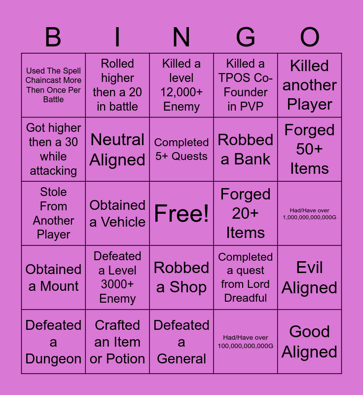 This bingo card has a free space and 24 words: Defeated a Level 3000+ Enemy, Crafted an Item or Potion, Completed 5+ Quests, Defeated a Dungeon, Killed another Player, Used The Spell Chaincast More Then Once Per Battle, Got higher then a 30 while attacking, Rolled higher then a 20 in battle, Forged 20+ Items, Robbed a Shop, Robbed a Bank, Stole From Another Player, Completed a quest from Lord Dreadful, Evil Aligned, Neutral Aligned, Had/Have over 100,000,000,000G, Had/Have over 1,000,000,000,000G, Killed a level 12,000+ Enemy, Forged 50+ Items, Obtained a Vehicle, Good Aligned, Obtained a Mount, Killed a TPOS Co-Founder in PVP and Defeated a General.