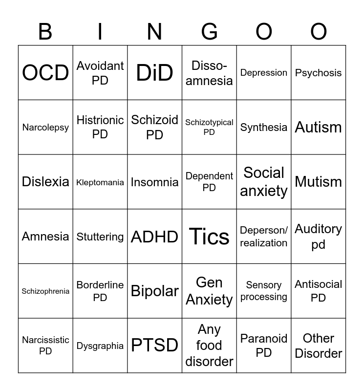 This bingo card has 36 words: Gen Anxiety, Bipolar, Any food disorder, Narcolepsy, Amnesia, Dependent PD, Histrionic PD, PTSD, Depression, Sensory processing, Autism, Disso-amnesia, Antisocial PD, Kleptomania, Schizotypical PD, OCD, Schizophrenia, Social anxiety, Dislexia, DiD, Insomnia, Stuttering, Tics, ADHD, Deperson/ realization, Avoidant PD, Synthesia, Dysgraphia, Schizoid PD, Psychosis, Other Disorder, Narcissistic PD, Auditory pd, Mutism, Borderline PD and Paranoid PD.