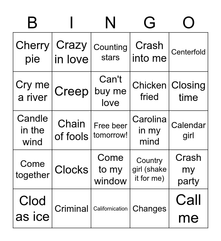 This bingo card has a free space and 48 words: California girls, Call me, Call me maybe, Californication, Clocks, Cruise, Crazy in love, Crash and burn, Cry me a river, Crazy, Creep, Crash into me, Crash my party, Country girl (shake it for me), Come as you are, Come on eileen, Can't buy me love, Carolina in my mind, Carry on wayward son, Centerfold, Chain of fools, Changes, Cherry pie, Chicken fried, Close to you, Closing time, Clod as ice, Come a little closer, Come to my window, Come together, Comfortably numb, Complicated, Copacabana, Cradle of love, Criminal, Crocodile rock, Cuts like a knife, Calendar girl, Careless whisper, Cupid, Crazy town, Crushin' it, Counting stars, Cat scratch fever, Candle in the wind, Crazy on you, Can't help falling in love and Carolina.