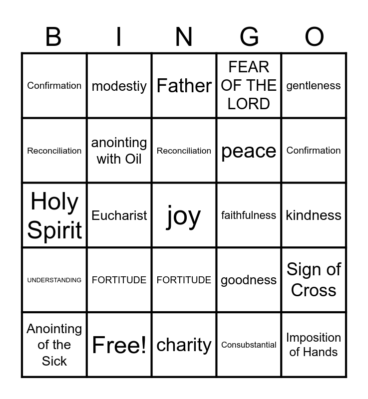 ⚠ This card has duplicate items: KNOWLEDGE (2), UNDERSTANDING (2), WISDOM (2), COUNSEL (2), FORTITUDE (2), PIETY (2), FEAR OF THE LORD (2), Baptism (2), Reconciliation (2), Eucharist (2), Confirmation (2), Matrimony (2), Anointing of the Sick (2), Holy Orders (2)