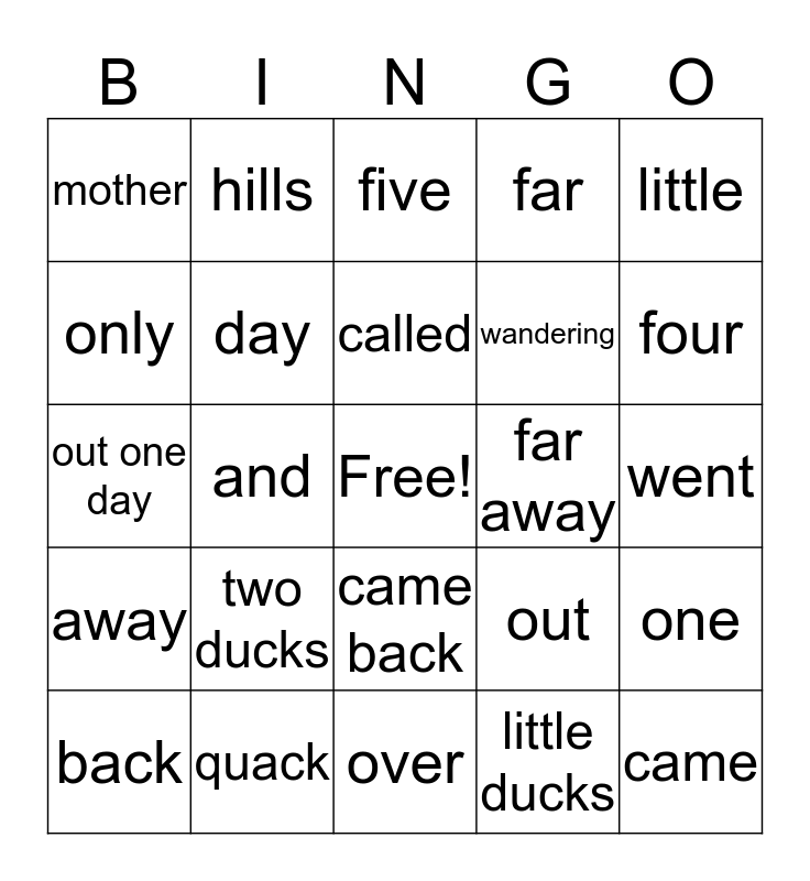 This bingo card has a free space and 24 words: two ducks, quack, called, back, little, mother, only, hills, far away, came back, wandering, out one day, out, one, day, little ducks, went, five, four, and, came, away, far and over.