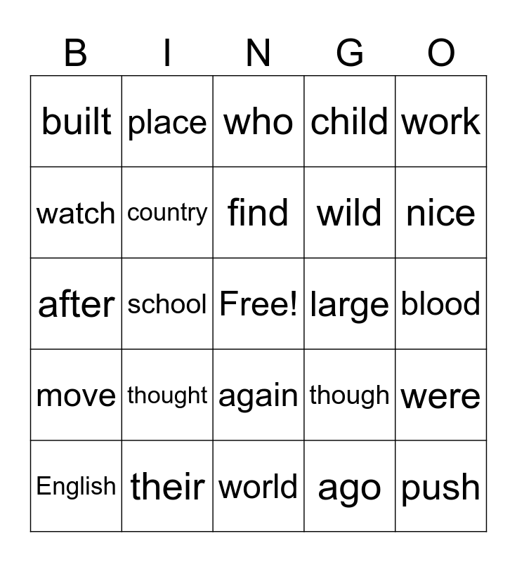 This bingo card has a free space and 33 words: friend, been, school, father, move, country, work, English, place, kind, find, who, ice, any, large, nice, their, after, thought, though, again, build, built, blood, world, push, child, wild, watch, were, love, ago and earth.