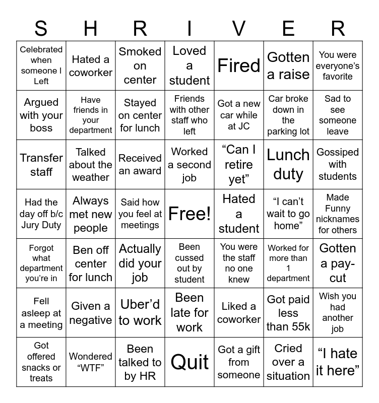 This bingo card has a free space and 48 words: Liked a coworker, Car broke down in the parking lot, Quit, Always met new people, Received an award, Made Funny nicknames for others, Hated a coworker, Wondered “WTF”, Gotten a raise, Been cussed out by student, You were everyone’s favorite, Loved a student, Lunch duty, “Can I retire yet”, Fell asleep at a meeting, “I can’t wait to go home”, Argued with your boss, Sad to see someone leave, Got paid less than 55k, Fired, Got a new car while at JC, Said how you feel at meetings, Celebrated when someone l Left, Have friends in your department, Wish you had another job, Stayed on center for lunch, Gossiped with students, Got offered snacks or treats, Worked a second job, Talked about the weather, Cried over a situation, Hated a student, Gotten a pay-cut, Given a negative, Had the day off b/c Jury Duty, You were the staff no one knew, Worked for more than 1 department, Transfer staff, Actually did your job, Uber’d to work, Forgot what department you’re in, “I hate it here”, Smoked on center, Been talked to by HR, Friends with other staff who left, Been late for work, Ben off center for lunch and Got a gift from someone.