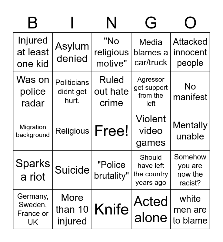 This bingo card has a free space and 24 words: Suicide, More than 10 injured, Ruled out hate crime, Germany, Sweden, France or UK, Attacked innocent people, Injured at least one kid, Was on police radar, Asylum denied, Violent video games, "Police brutality", Agressor get support from the left, Migration background, Should have left the country years ago, Somehow you are now the racist?, Politicians didnt get hurt., Acted alone, Mentally unable, "No religious motive", No manifest, Religious, white men are to blame, Sparks a riot, Media blames a car/truck and Knife.