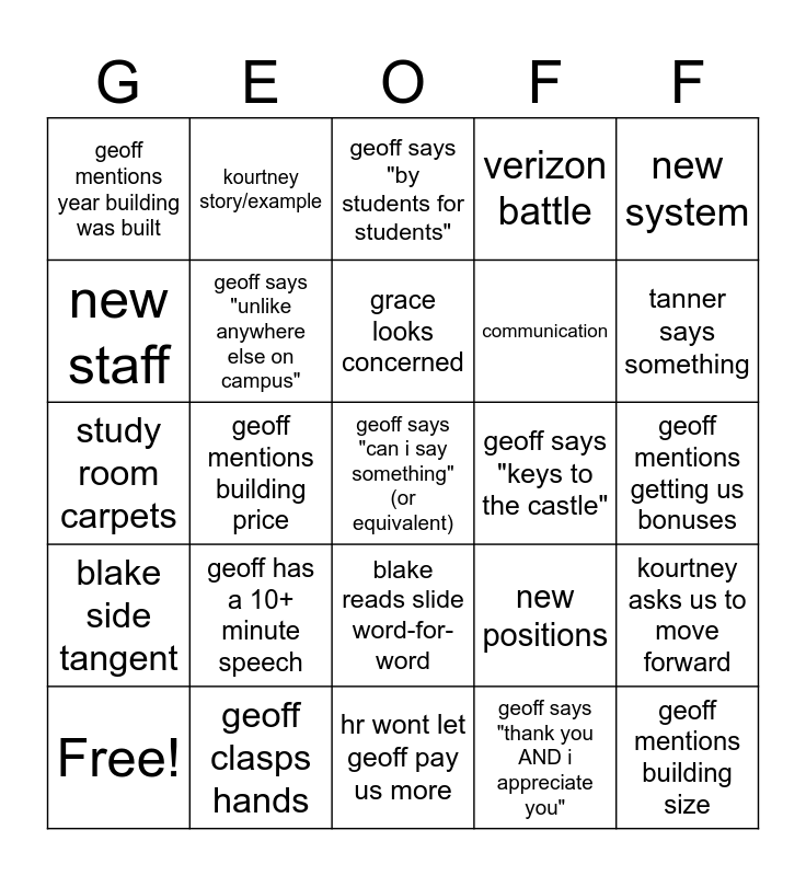 This bingo card has 29 words: Free!, geoff mentions taking ownership, geoff mentions building price, geoff mentions building size, geoff mentions year building was built, geoff says "by students for students", geoff says "unlike anywhere else on campus", geoff has a 10+ minute speech, geoff says "keys to the castle", geoff clasps hands, geoff mentions getting us bonuses, geoff says "can i say something" (or equivalent), hr wont let geoff pay us more, geoff says "thank you AND i appreciate you", tanner says something, submit hours !, blake reads slide word-for-word, blake side tangent, new system, study room carpets, new positions, be more consistent, communication, new staff, verizon battle, kourtney story/example, kourtney asks us to move forward, grace looks concerned and kourtney runs to give someone microphone.
