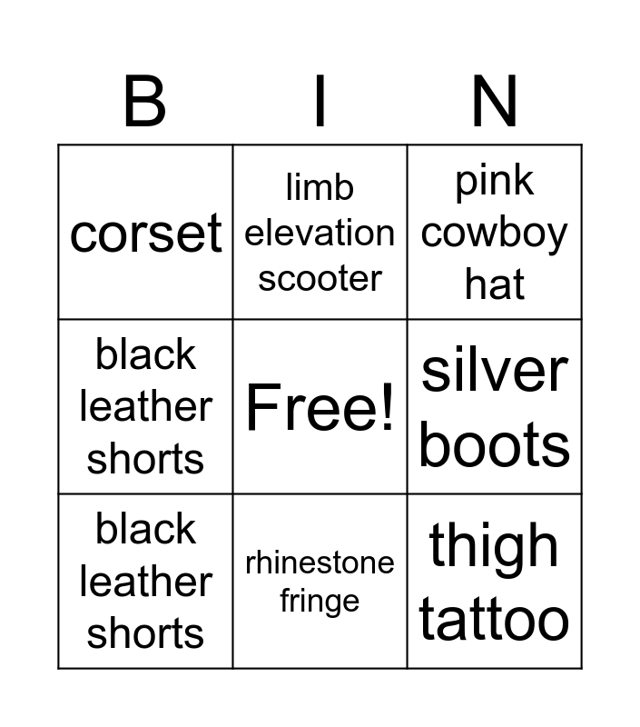This bingo card has a free space and 11 words: indian headdress, rhinestone fringe, thigh tattoo, black leather shorts, limb elevation scooter, pink cowboy hat, silver boots, astros jersey, black leather shorts, corset and astros jersey.