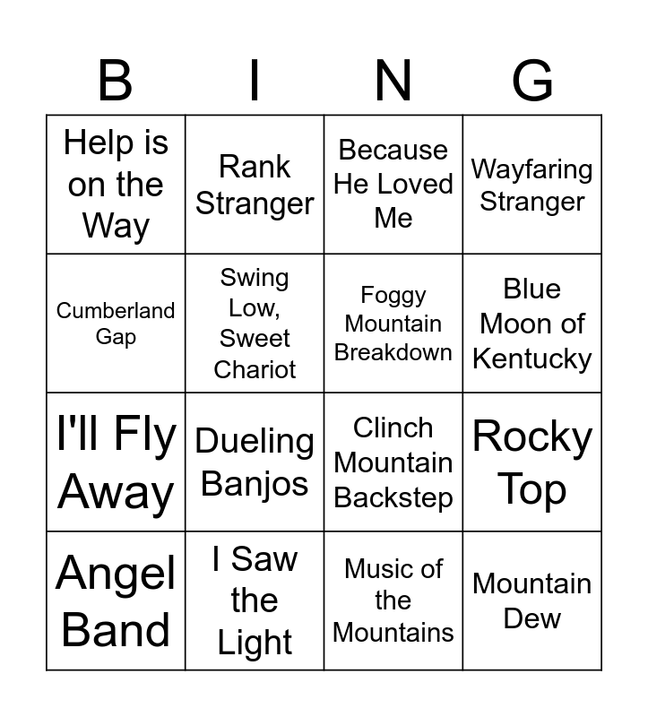 This bingo card has 16 words: I Saw the Light, Rocky Top, Because He Loved Me, Help is on the Way, I'll Fly Away, Rank Stranger, Clinch Mountain Backstep, Music of the Mountains, Cumberland Gap, Swing Low, Sweet Chariot, Angel Band, Wayfaring Stranger, Dueling Banjos, Blue Moon of Kentucky, Foggy Mountain Breakdown and Mountain Dew.