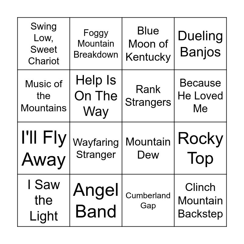 This bingo card has 16 words: Angel Band, Rocky Top, Blue Moon of Kentucky, Swing Low, Sweet Chariot, I'll Fly Away, Foggy Mountain Breakdown, Mountain Dew, Cumberland Gap, Music of the Mountains, Help Is On The Way, I Saw the Light, Dueling Banjos, Wayfaring Stranger, Because He Loved Me, Rank Strangers and Clinch Mountain Backstep.