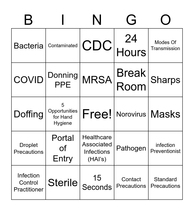 This bingo card has a free space and 47 words: Red Bag, Standard Precautions, Hair Nets, 15 Seconds, Portal of Entry, AIDS, Contaminated, Droplet transmission, COVID, N95, Donning PPE, 24 Hours, infection Preventionist, Pathogen, Antisepsis, Airborne Transmission, MRSA, Norovirus, CAUTI, Modes Of Transmission, 5 Opportunities for Hand Hygiene, Contact Precautions, Bacteria, Break Room, Biohazard, Sharps, Infection Control Practitioner, Dirty/Used Aprons, Healthcare Associated Infections (HAI’s), Droplet Precautions, Hand Hygiene, Doffing PPE, Bloodborne pathogen, Isolation, Clean, Sterile, Masks, 72 Hours, Asepsis, Contact Transmission, TB, CDC, Doffing, Influenza, 20 Seconds of Hand Washing, CLABSI and Apply Soap.