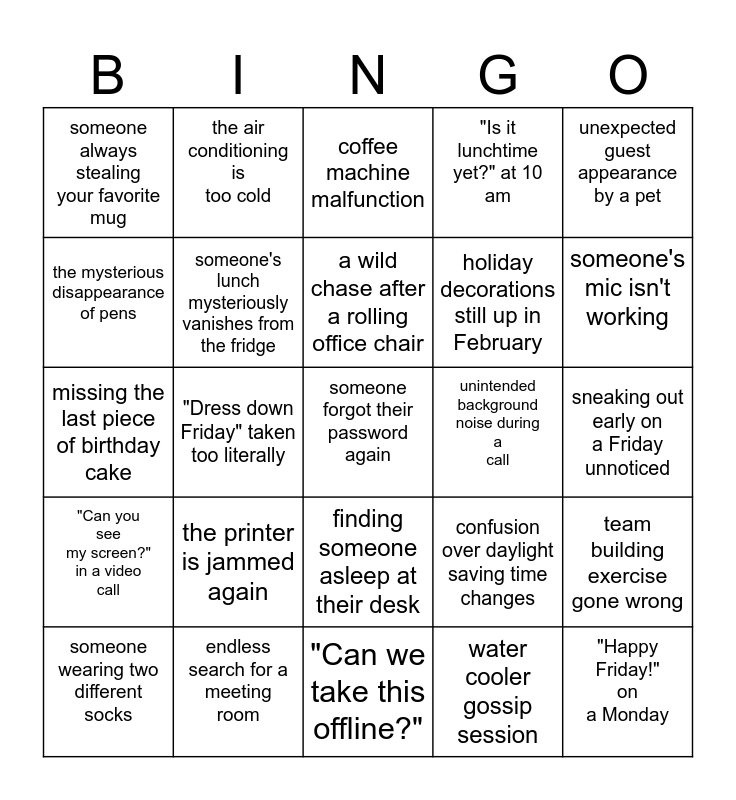 This bingo card has 25 words: the printer is jammed again, "Can we take this offline?", a wild chase after a rolling office chair, someone wearing two different socks, unexpected guest appearance by a pet, someone always stealing your favorite mug, the mysterious disappearance of pens, the air conditioning is too cold, unintended background noise during a call, finding someone asleep at their desk, holiday decorations still up in February, missing the last piece of birthday cake, confusion over daylight saving time changes, team building exercise gone wrong, someone's lunch mysteriously vanishes from the fridge, "Happy Friday!" on a Monday, sneaking out early on a Friday unnoticed, coffee machine malfunction, someone's mic isn't working, "Dress down Friday" taken too literally, someone forgot their password again, endless search for a meeting room, "Can you see my screen?" in a video call, "Is it lunchtime yet?" at 10 am and water cooler gossip session.