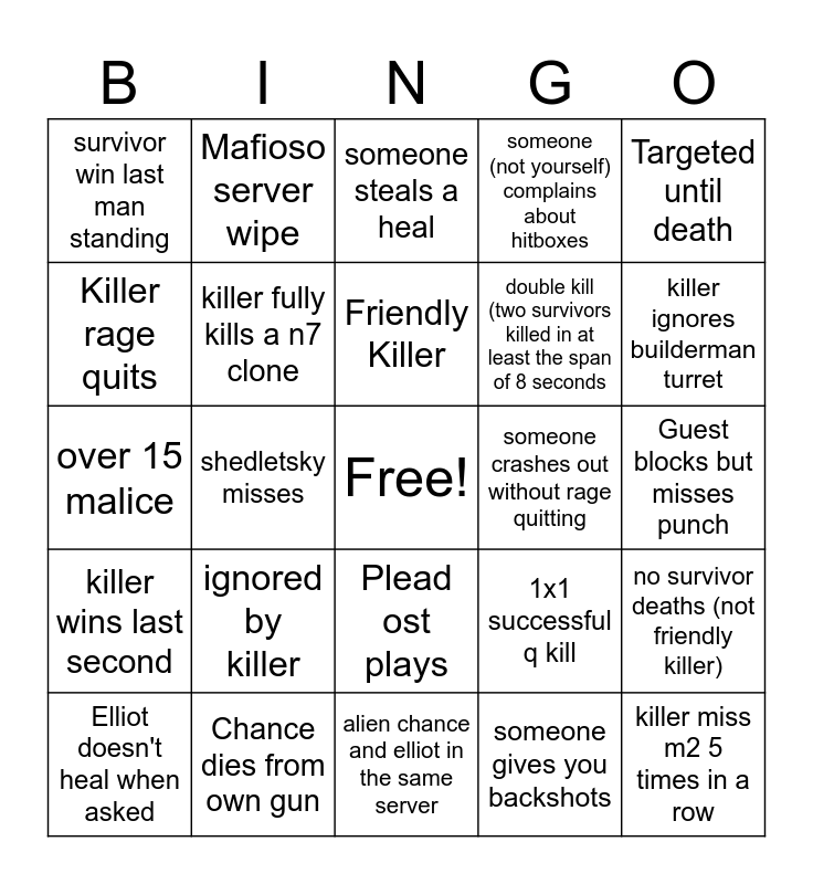 This bingo card has a free space and 24 words: ignored by killer, Chance dies from own gun, Friendly Killer, Elliot doesn't heal when asked, Targeted until death, survivor win last man standing, Killer rage quits, Mafioso server wipe, someone crashes out without rage quitting, Plead ost plays, double kill (two survivors killed in at least the span of 8 seconds, over 15 malice, 1x1 successful q kill, no survivor deaths (not friendly killer), killer fully kills a n7 clone, someone gives you backshots, Guest blocks but misses punch, someone steals a heal, killer ignores builderman turret, shedletsky misses, killer miss m2 5 times in a row, killer wins last second, someone (not yourself) complains about hitboxes and alien chance and elliot in the same server.