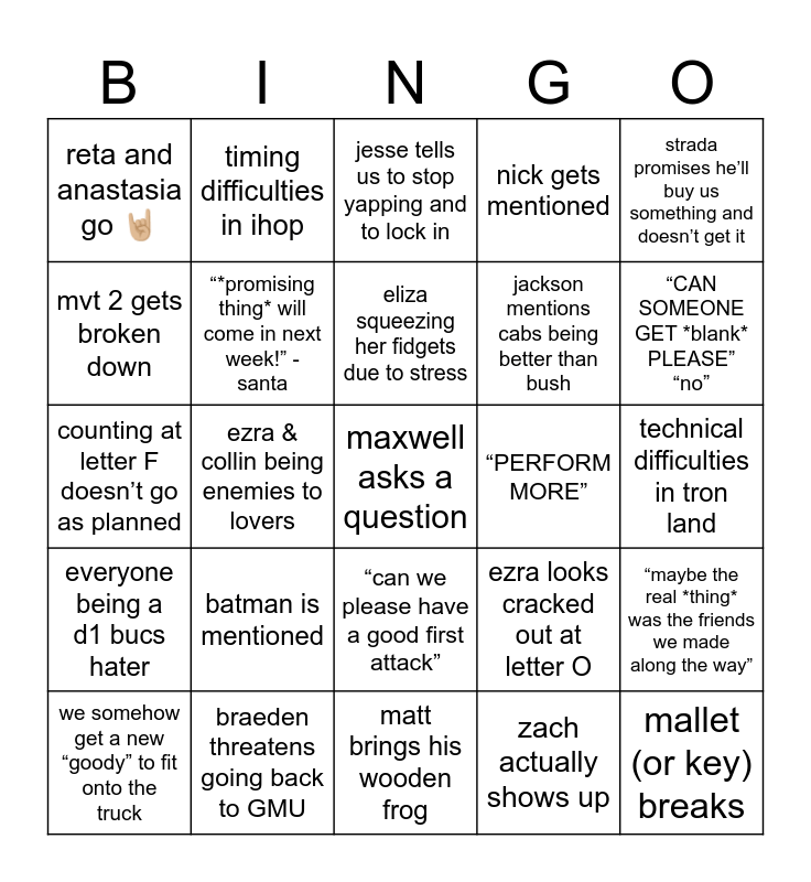 This bingo card has a free space and 24 words: batman is mentioned, braeden threatens going back to GMU, eliza squeezing her fidgets due to stress, we somehow get a new “goody” to fit onto the truck, strada promises he’ll buy us something and doesn’t get it, reta and anastasia go 🤘🏼, mvt 2 gets broken down, timing difficulties in ihop, “PERFORM MORE”, “can we please have a good first attack”, jackson mentions cabs being better than bush, counting at letter F doesn’t go as planned, ezra looks cracked out at letter O, “maybe the real *thing* was the friends we made along the way”, “*promising thing* will come in next week!” - santa, zach actually shows up, technical difficulties in tron land, jesse tells us to stop yapping and to lock in, “CAN SOMEONE GET *blank* PLEASE” “no”, ezra & collin being enemies to lovers, mallet (or key) breaks, everyone being a d1 bucs hater, nick gets mentioned and matt brings his wooden frog.