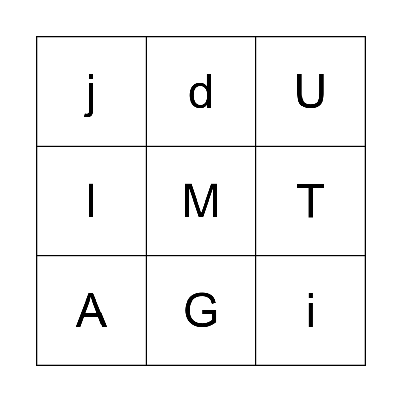This bingo card has 9 words: A, U, d, l, j, T, M, i and G.
