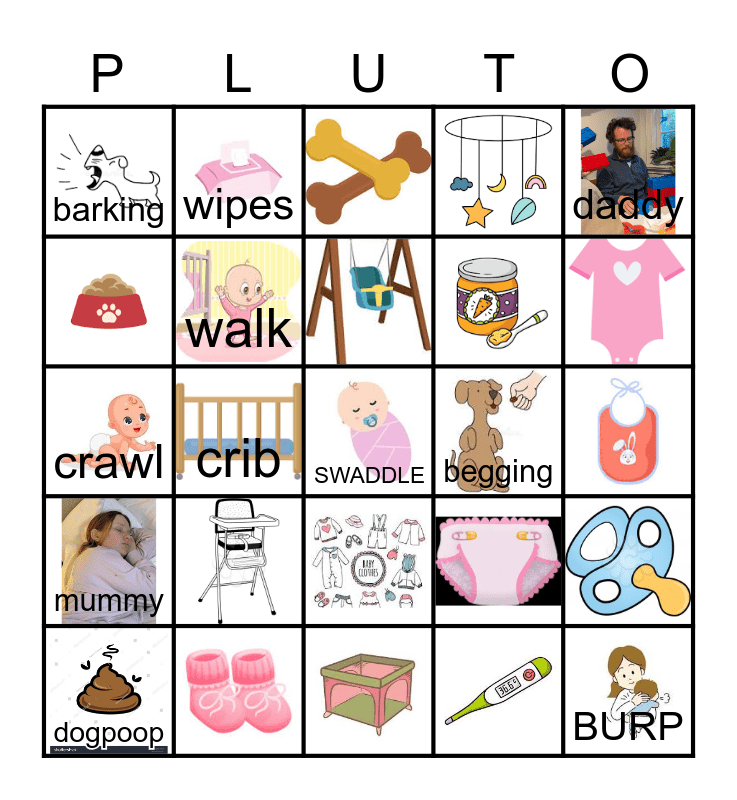 This bingo card has 45 images and 21 words: crib, BURP, sleeping, wipes, RATTLE, crying, barking, SWADDLE, Pluto, dogpoop, PU., towel, mummy, leash, family, daddy, crawl, walk, running, begging and eating.