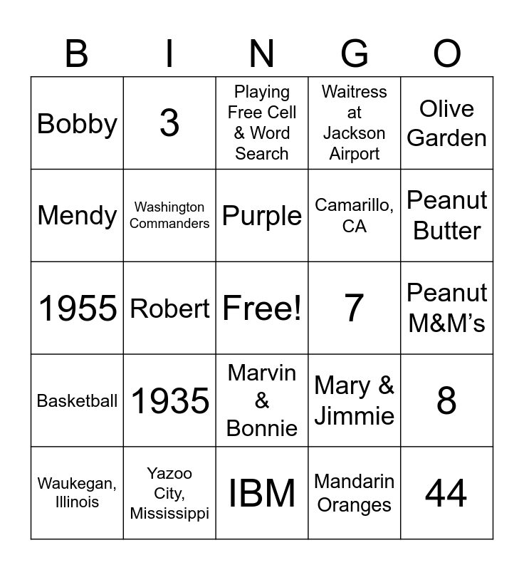 This bingo card has a free space and 24 words: 1935, Yazoo City, Mississippi, Purple, Waukegan, Illinois, Olive Garden, Bobby, Mendy, 3, 7, Marvin & Bonnie, Camarillo, CA, 1955, Mary & Jimmie, 8, Washington Commanders, Mandarin Oranges, Peanut M&M’s, Playing Free Cell & Word Search, Peanut Butter, Robert, 44, Basketball, Waitress at Jackson Airport and IBM.