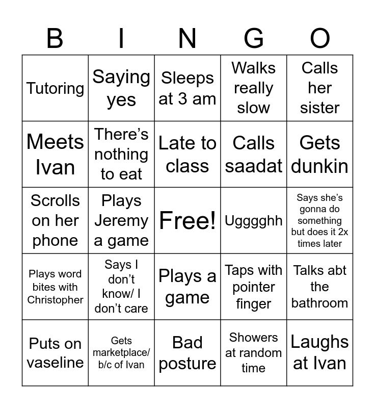 This bingo card has a free space and 24 words: Says I don’t know/ I don’t care, Gets marketplace/ b/c of Ivan, Late to class, Puts on vaseline, Calls her sister, Tutoring, Meets Ivan, Saying yes, Ugggghh, Plays a game, Calls saadat, Scrolls on her phone, Taps with pointer finger, Talks abt the bathroom, There’s nothing to eat, Showers at random time, Says she’s gonna do something but does it 2x times later, Sleeps at 3 am, Gets dunkin, Plays Jeremy a game, Laughs at Ivan, Plays word bites with Christopher, Walks really slow and Bad posture.