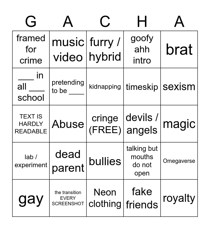 This bingo card has a free space and 31 words: Neon clothing, Drugs, Abuse, themes of depression, framed for crime, furry / hybrid, pretending to be ____, talking but mouths do not open, devils / angels, fake friends, magic, royalty, emotionless, plot twist, sexism, reincarnation, Omegaverse, dead parent, lab / experiment, bullies, brat, adopted, gay, music video, timeskip, ___ in all ___ school, goofy ahh intro, TEXT IS HARDLY READABLE, the transition EVERY SCREENSHOT, kidnapping and colored hair.