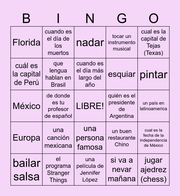 This bingo card has a free space and 35 words: hablar francés, Nueva York, nadar, que lengua hablan en Brasil, una persona famosa, tocar un instrumento musical, cuál es la capital de Perú, la abuela de tu mejor amigo, cuando es el día más largo del año, cocinar un pastel, México, cual es la capital de Tejas (Texas), cual es la ciudad más grande en Latinoamérica, quien es el gobernador de California, Florida, quién es el presidente de Argentina, si va a nevar mañana, de donde es tu profesor de español, Europa, jugar ajedrez (chess), un buen restaurante Chino, bailar salsa, cual es la fecha de la independencia de México, el programa Stranger Things, nadar, pintar, quién es don Quijote, cuantos senadores hay en senado, esquiar, un país en latinoamerica, un buen restaurante mexicano, una película de Jennifer López, una canción mexicana, cuando es el día de los muertos and jugar.