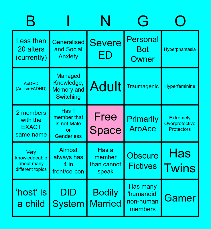 This bingo card has a free space and 24 words: Almost always has 4 in front/co-con, DID System, Adult, ‘host’ is a child, Hyperphantasia, Less than 20 alters (currently), AuDHD (Autism+ADHD), Generalised and Social Anxiety, Primarily AroAce, Has a member than cannot speak, Traumagenic, 2 members with the EXACT same name, Obscure Fictives, Has Twins, Managed Knowledge, Memory and Switching, Has many ‘humanoid’ non-human members, Extremely Overprotective Protectors, Severe ED, Hyperfeminine, Has 1 member that is not Male or Genderless, Gamer, Very knowledgeable about many different topics, Personal Bot Owner and Bodily Married.