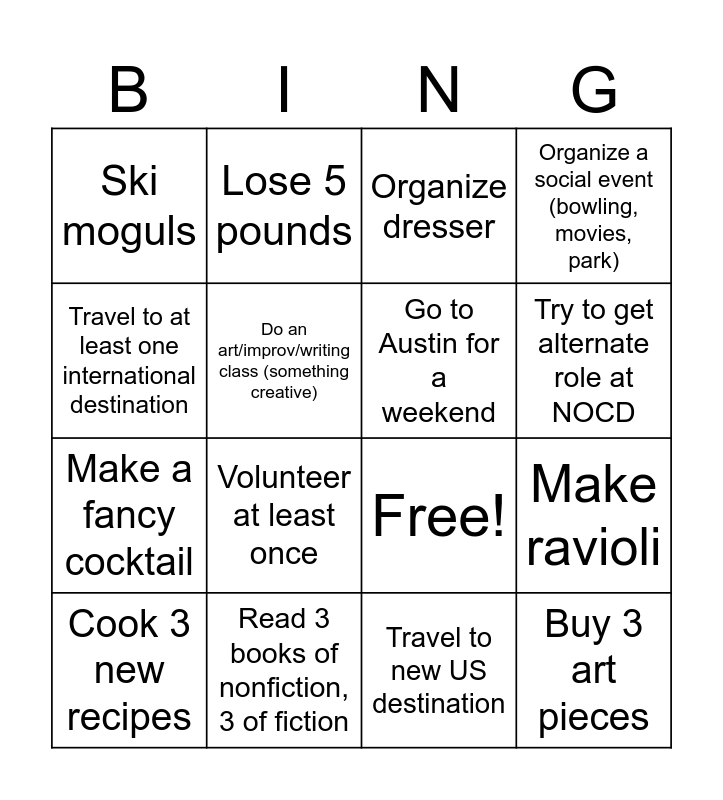 This bingo card has 19 words: Free!, Host a dinner party, Organize dresser, Buy 3 art pieces, Make ravioli, Travel to at least one international destination, Travel to new US destination, Ski moguls, Lose 5 pounds, Make a fancy cocktail, Volunteer at least once, Do an art/improv/writing class (something creative), Go to Austin for a weekend, Read 3 books of nonfiction, 3 of fiction, Cook 3 new recipes, Bike 75 miles a week in the summer, Organize a social event (bowling, movies, park), Try to get alternate role at NOCD and Join tennis league.
