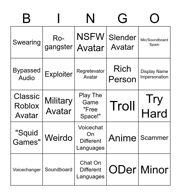 This bingo card has a free space and 29 words: Voicechanger, Furry Avatar, Military Avatar, Avatar From Shows & Games, Swearing, NSFW Avatar, Exploiter, Weirdo, Troll, Soundboard, Try Hard, Minor, Chat On Different Languages, ODer, Display Name Impersonation, Racist Avatar, Voicechat On Different Languages, "Squid Games", Mic/Soundboard Spam, Classic Roblox Avatar, Anime, Headless Korblox, Rich Person, Bypassed Audio, Slender Avatar, Ro-gangster, Scammer, Regretevator Avatar and Cringe Audio.